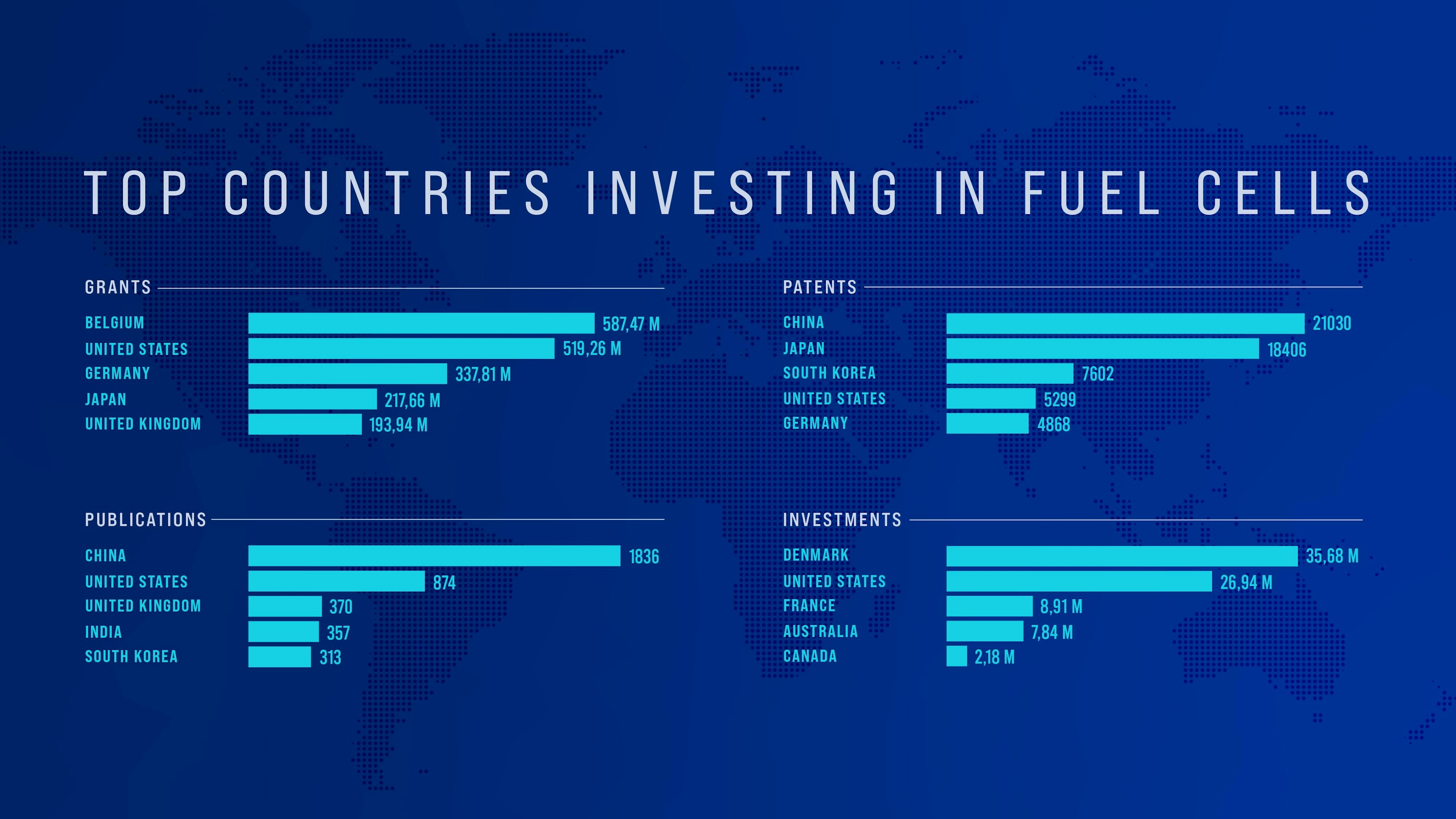 L'Atelier’s Technology Intelligence Engine suggests Europe leads in terms of grants and investments in fuel cell R&D. This is not just through the European Commission’s budget (see “Belgium” data below): Germany, the United Kingdom and Denmark have all put money on fuel cells.