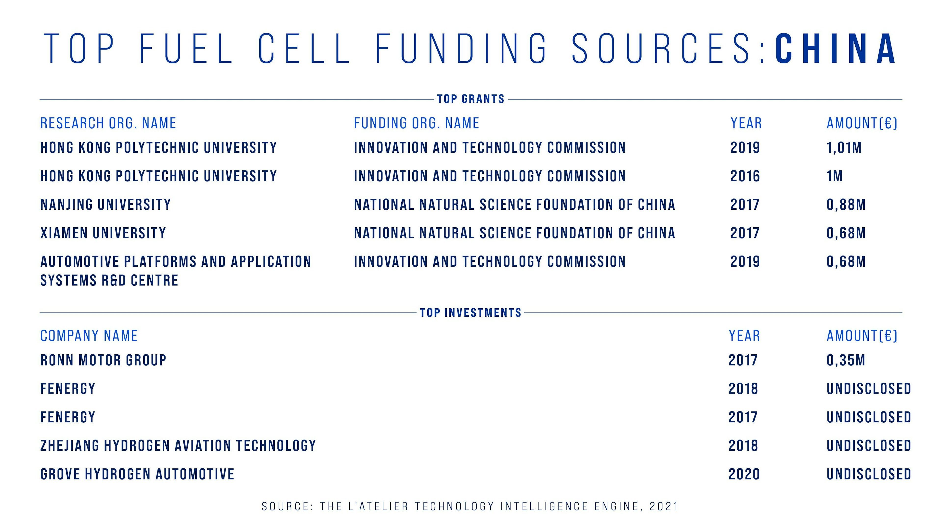 Top fuel cell grants & investments (China). Source: The L'Atelier Technology Intelligence Engine.