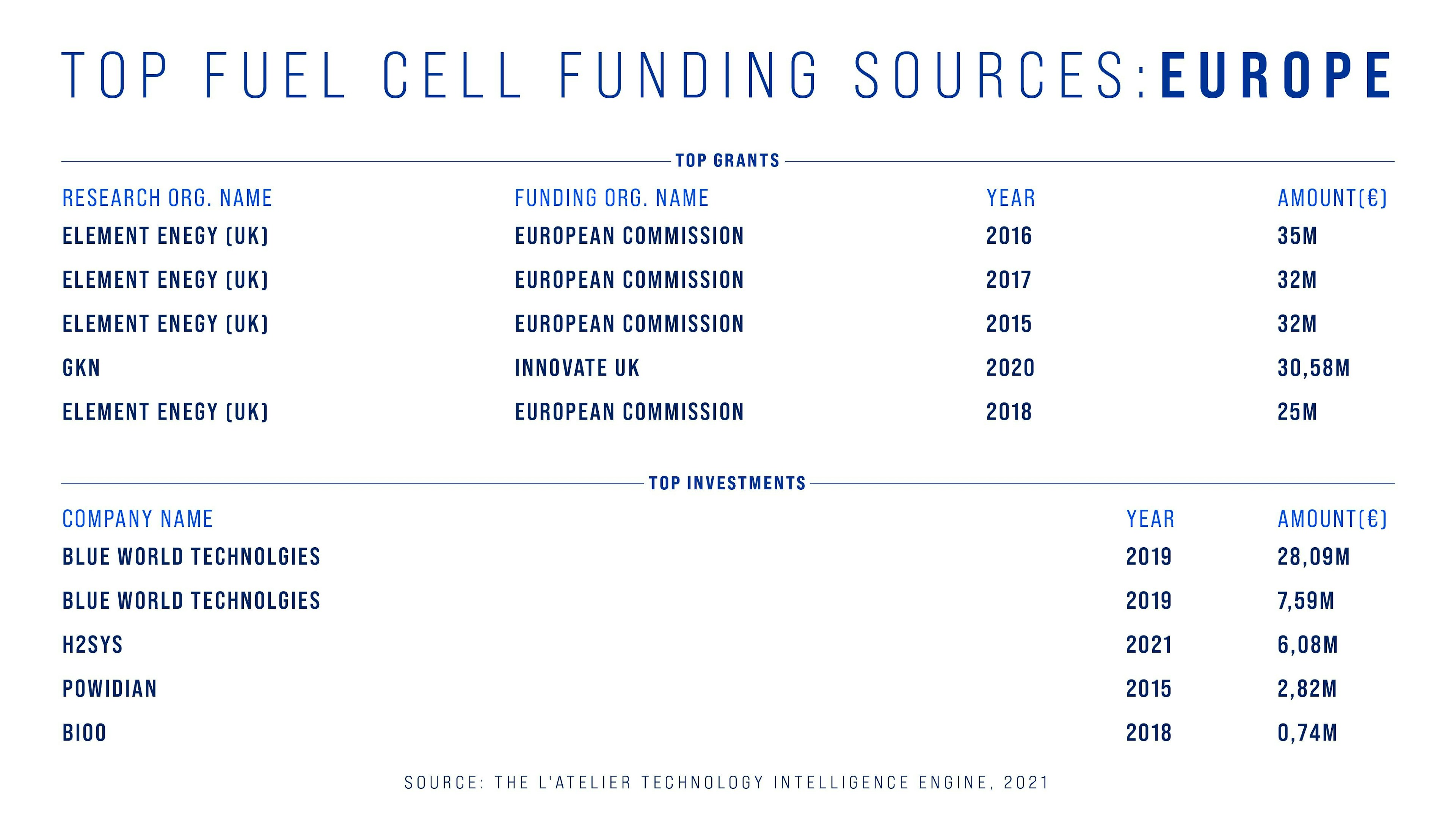 Top fuel cell grants & investments (Europe). Source: The L'Atelier Technology Intelligence Engine.