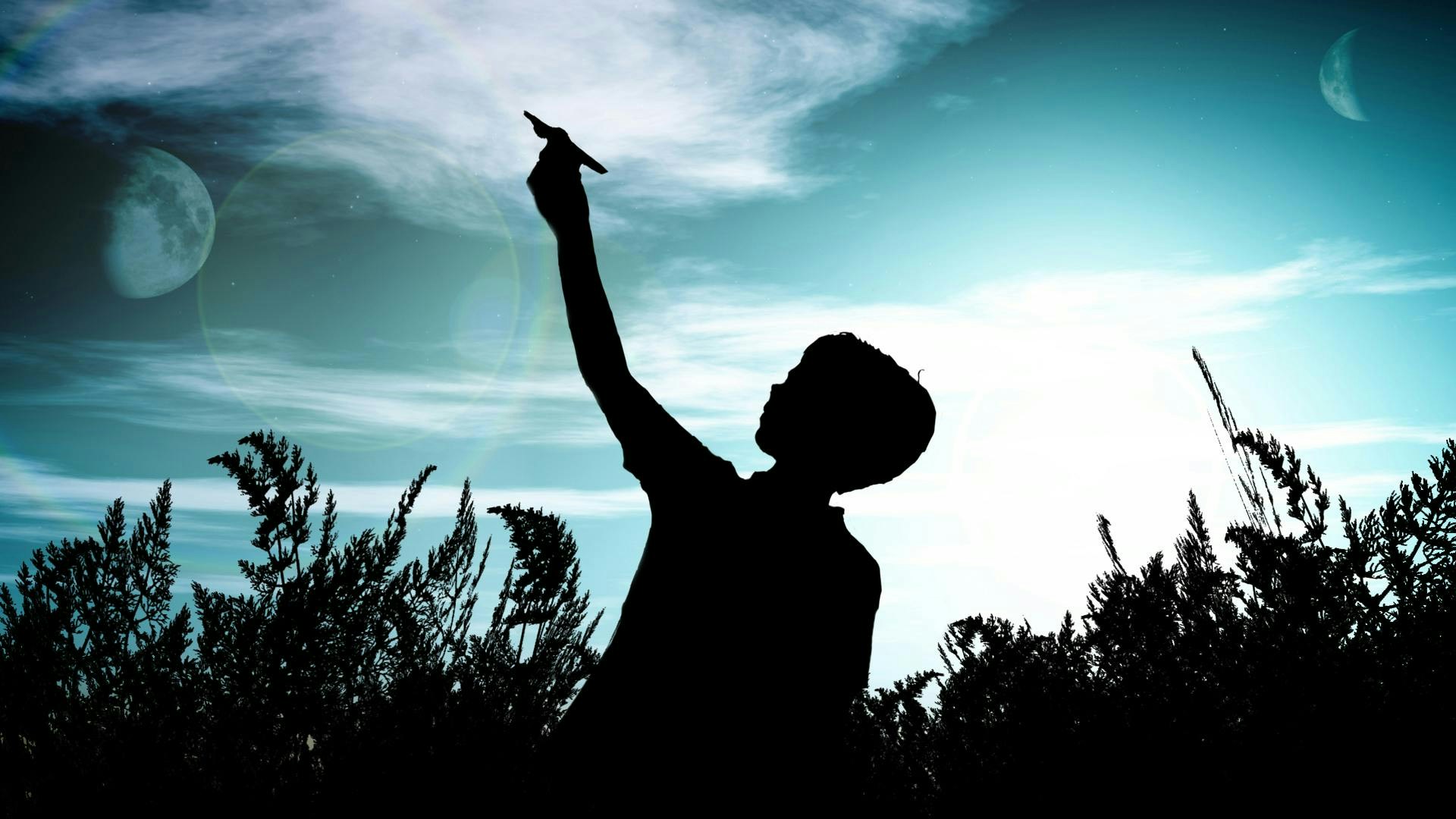 A child simulates spaceflight against a sky with two heavenly bodies.