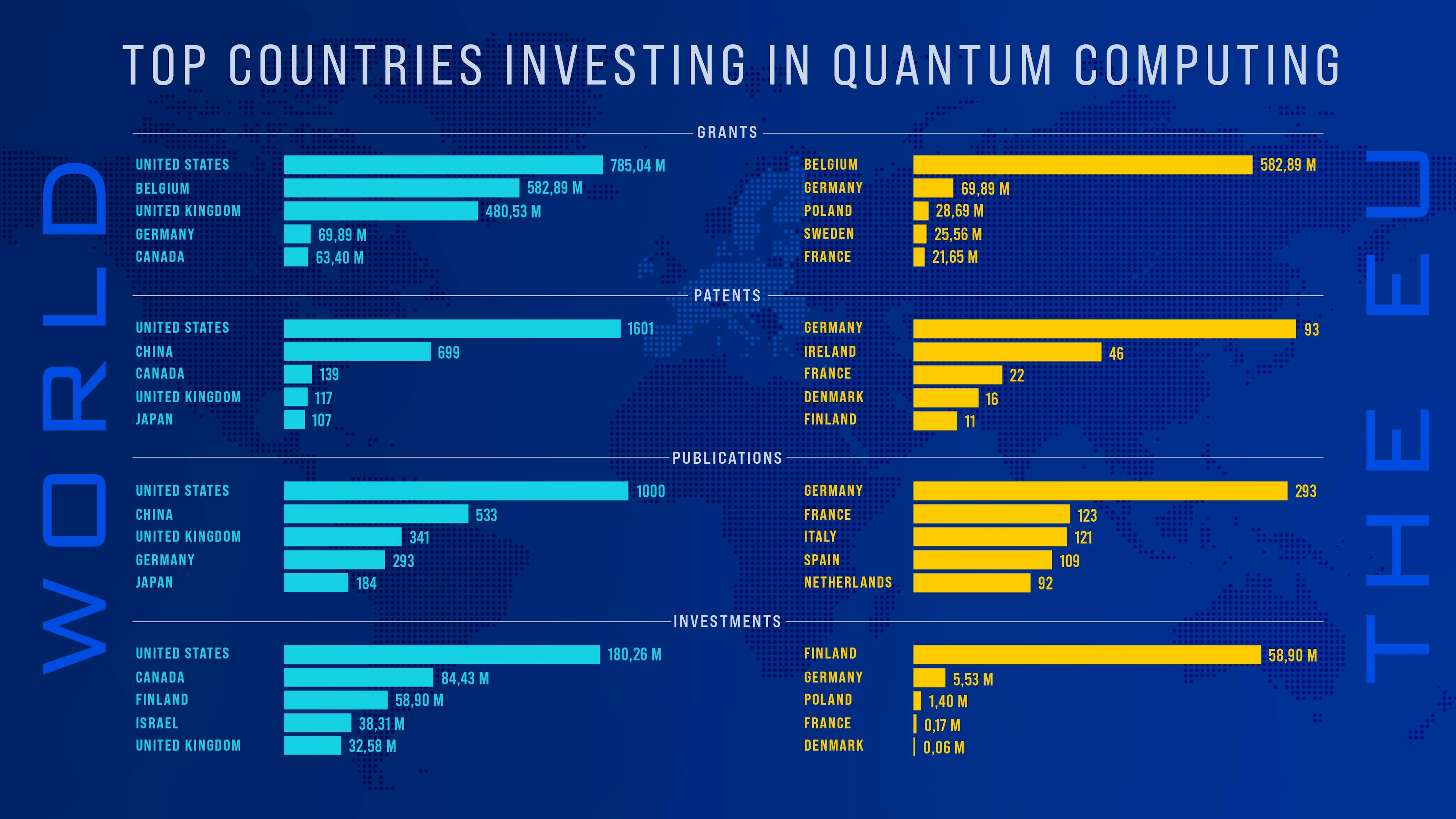 Top countries invested in quantum computing (world and EU). Source: L'Atelier's technology intelligence engine.
